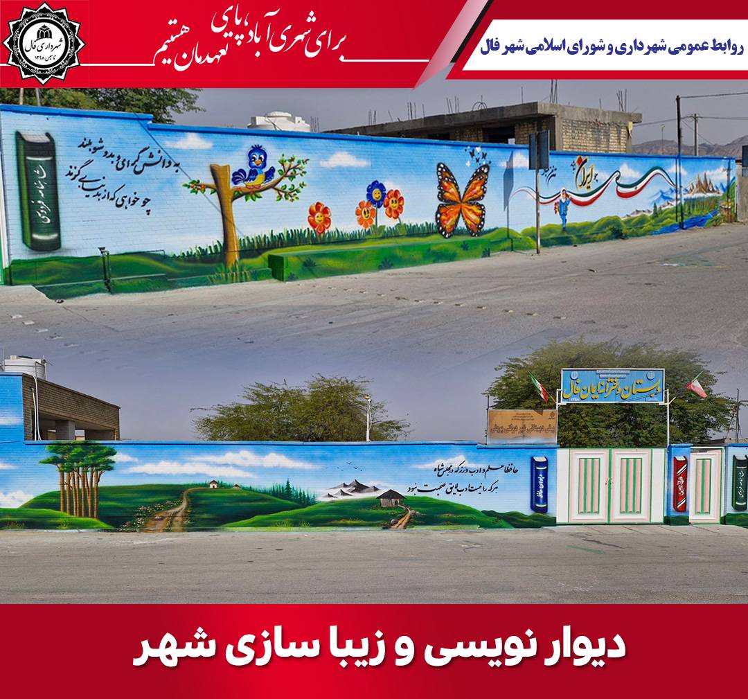 🔹 شهرداری و شورای اسلامی شهر فال در راستای بهبود مبلمان شهری و آراستگی سیمای عمومی شهر و ایجاد نشاط و شادی در بین شهروندان، عملیات نقاشی و دیوارنگاری آموزشگاه ایمان واقع در خیابان میراث با مضامین فرهنگی، اجتماعی ، بهداشتی و مذهبی را اجرا کرد